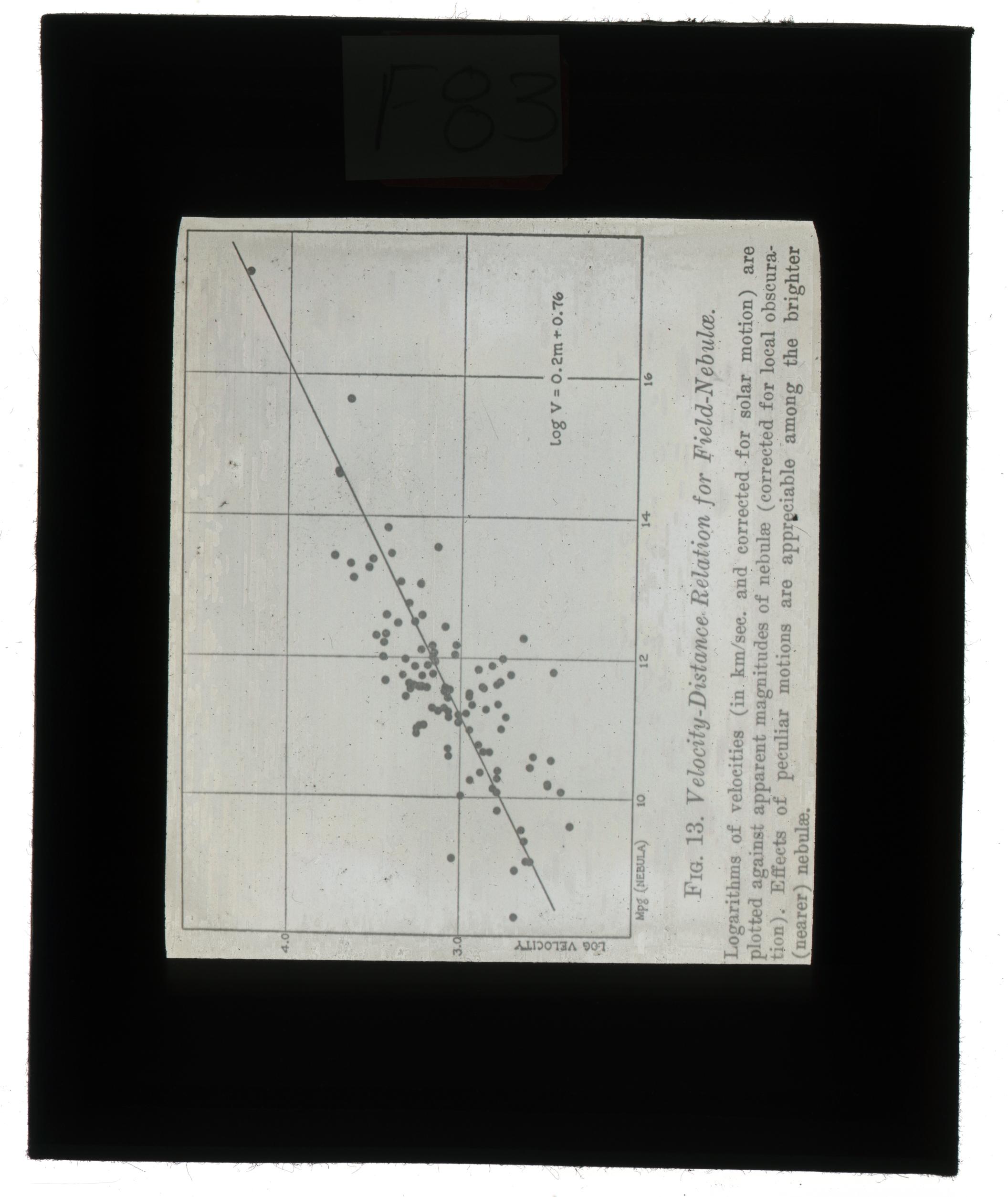 This is a teaching slide. It contains a plot of the logarithm of velocity against magnitude of various nebulae.